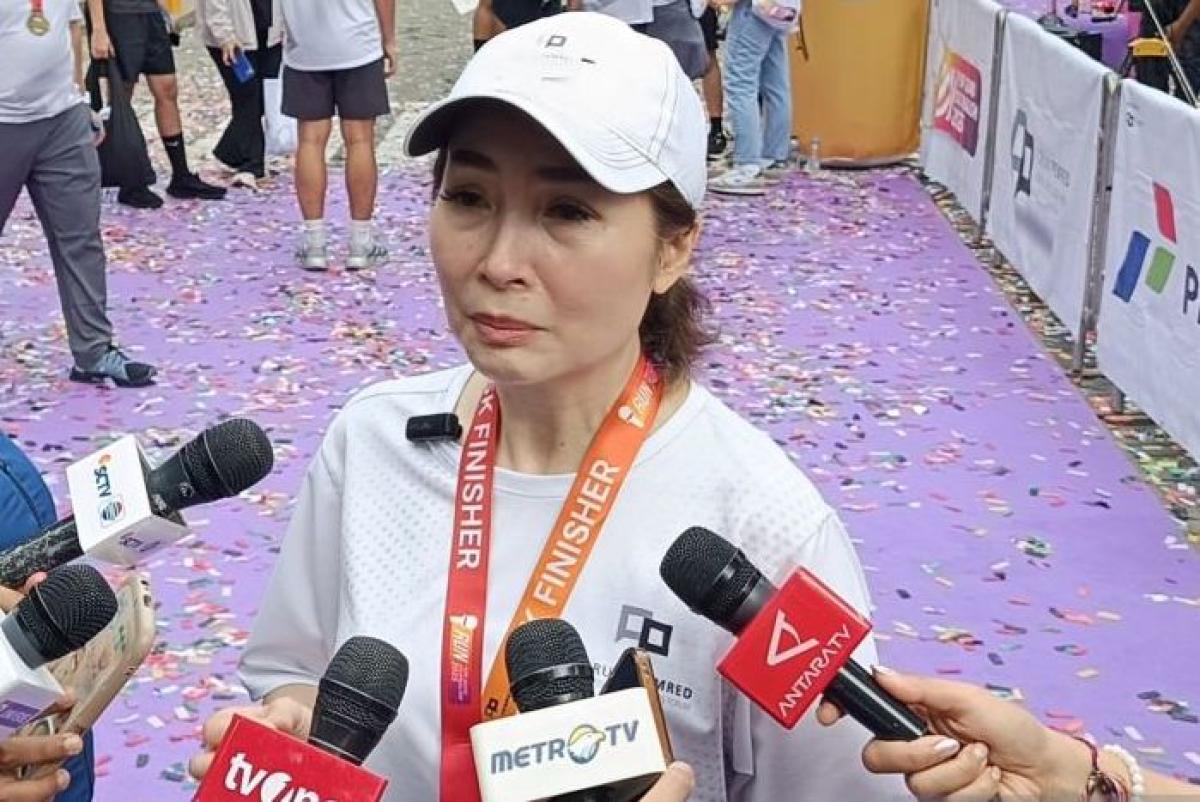 Ketua Forum Pemred Retno Pinasti usai Run for Good Journalism 2025 by Forum Pemred yang turut dihadiri Menteri Keuangan (Menkeu) Purbaya Yudhi Sadewa di Jakarta, Minggu (16/11/2025). (ANTARA/Muzdaffar Fauzan)